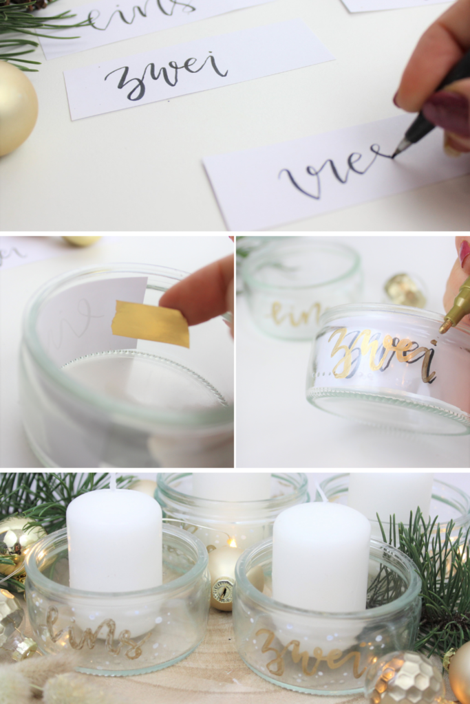 Danach habe ich mir kleine Zettel geschnitten, welche genau im mein Einmachglas passen. Darauf habe ich mit einem Brushpen die Zahlen ausgeschrieben gelettert. Alternativ kannst du dir natürlich auch einen Schriftzug in der passenden Größe ausdrucken und diese dann als Vorlage nehmen. Klebe mit ein wenig Klebeband den Zettel im Einmachglas fest und übertrage den Schriftzug auf deinen DIY Adventskranz.