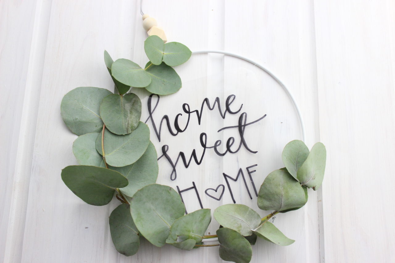 Die Naturmaterialien werden genauso wie das Lettering mit Draht am Ring befestigt. Das schöne an den Eukalyptus Zweigen ist, dass die Blätter den Draht mal wieder verstecken. Ich liebe es mit Eukalyptus zu basteln, da es dann immer so gut duftet!